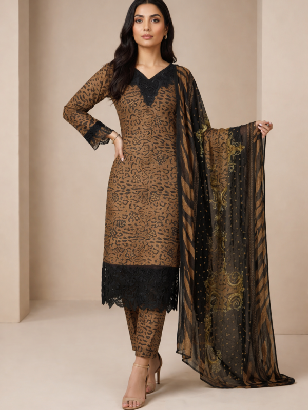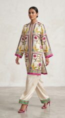 The soft ivory base enhances the overall elegance, while the contrast of pink and green accents brings life to the design. Paired with smooth, satin-finish trousers, this ensemble offers a perfect balance of comfort and luxury.
