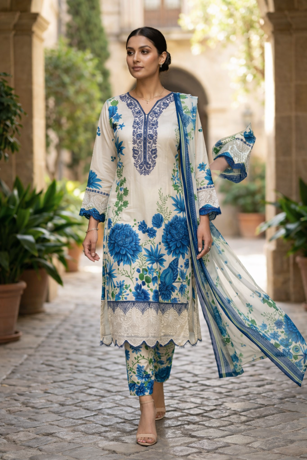 Off-white and blue floral printed 3 piece suit with detailed neckline, lace finished sleeves and hem, matching trousers, and printed chiffon dupatta.