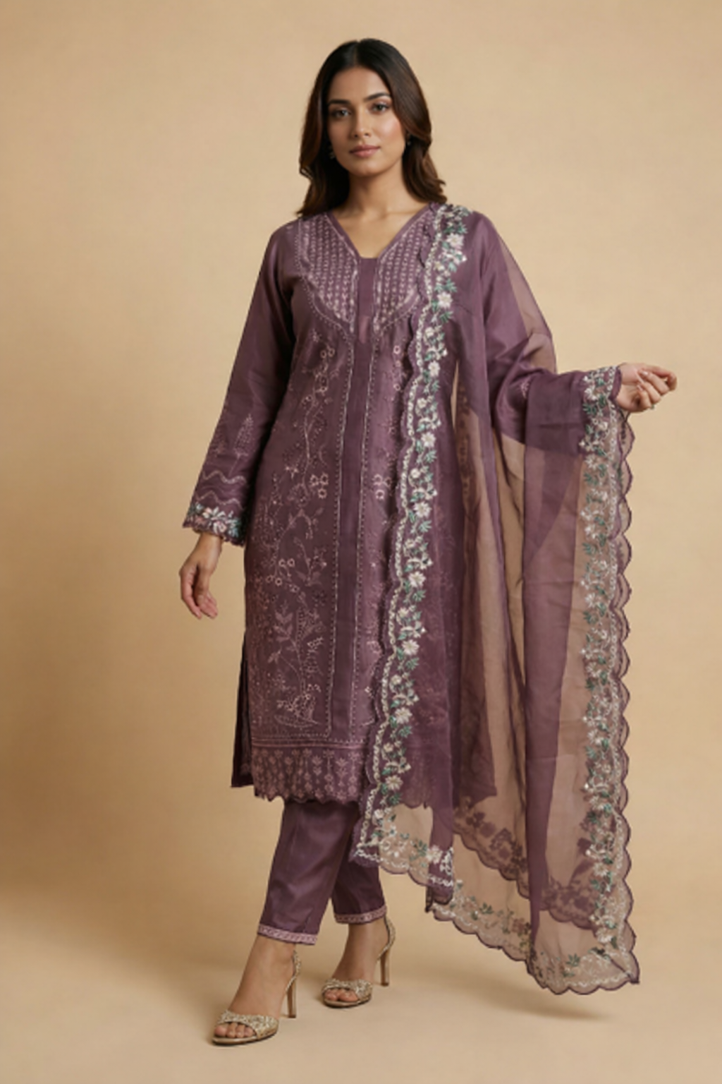 Plum colored 3 piece suit featuring detailed floral embroidery across the front panel with elegant threadwork patterns. The shirt includes embroidered sleeves and a finely embroidered hem border that enhances the traditional design. The outfit is paired with matching trousers and a coordinated chiffon dupatta with delicate embroidered floral borders for a graceful finish.